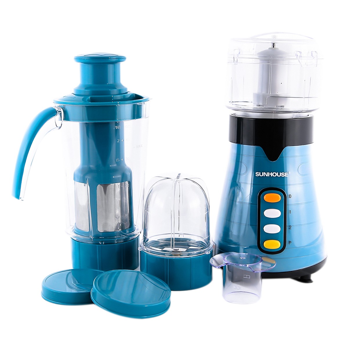 Máy xay sinh tố đa năng SUNHOUSE SHD5325 có thiết kế hiện đại với một cối xay sinh tố kèm lưới lọc bã và 1 thanh đẩy giúp bạn xay trái cây được nhanh hơn, sánh mịn hơn. Bên cạnh đó là 1 cối xay thực phẩm khô và 1 cối xay thịt, lưỡi dao Titanium siêu bền, đáp ứng mọi nhu cầu làm bếp của bạn.