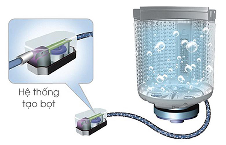 Hệ thống tạo bọt Air Bubble tăng khả năng hòa tan và tạo bọt bột giặt trong quá trình giặt giúp bột giặt thấm sâu vào quần áo, đánh bật và loại bỏ vết bẩn hiệu quả.